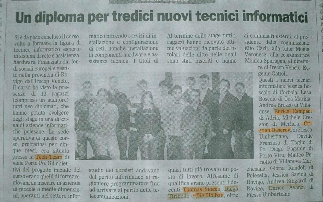 Concluso nel migliore dei modi il corso per Tecnico Informatico. Il corso della durata di cinque mesi tenuto presso la sede TECH.TEAM Informatica a Rovigo (presso Area Tosi) ha avuto lo scopo di formare tredici ragazzi, con preparazione tecnico-informatica di scuola superiore, fornendo loro nozioni sistemistiche per introdurli in aziende operanti nel settore informatico e non, all’interno delle quali si sono occupati di servizi di installazione e configurazione sia hardware che software. Il corso prevedeva al termine delle lezioni teorico-pratiche un periodo di stage al termine del quale tutti i partecipanti hanno ottenuto ottime valutazioni da parte delle aziende ospitanti. Molti di loro grazie a questa esperienza lavorativa hanno già trovato un posto di lavoro. All’esame finale sono stati presenti i docenti: Thomas Stocco, Ilie Holban e Diego Tiribello, assieme alla commissione formata dai commissari esterni, di cui è stato presidente il sig. Elio Carli, la tutor Dott. Monica Sparapan e il direttore di Irecoop Veneto sig. Eugenio Gattolin. I partecipanti al corso sono stati: Jessica Boscolo, Luca Boscolo, Andrea Brazzo, Enrico Campaci, Michele Creston, Cristian Descrovi, Davide Franzoso, Diego Paganin, Matteo Periotto, Gloria Randoli, Jessica Savioli, Andrea Siligardi, Enrico Avanzi.